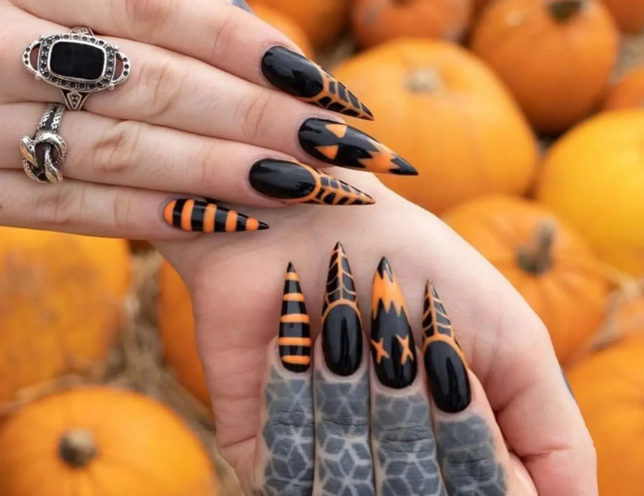 Контрастные полосы, объёмные элементы и яркие акценты — всё, что нужно, чтобы повторить фирменный стиль Битлджуса. Такой маникюр буквально «кричит» о празднике, сочетая безумие и эстетику.