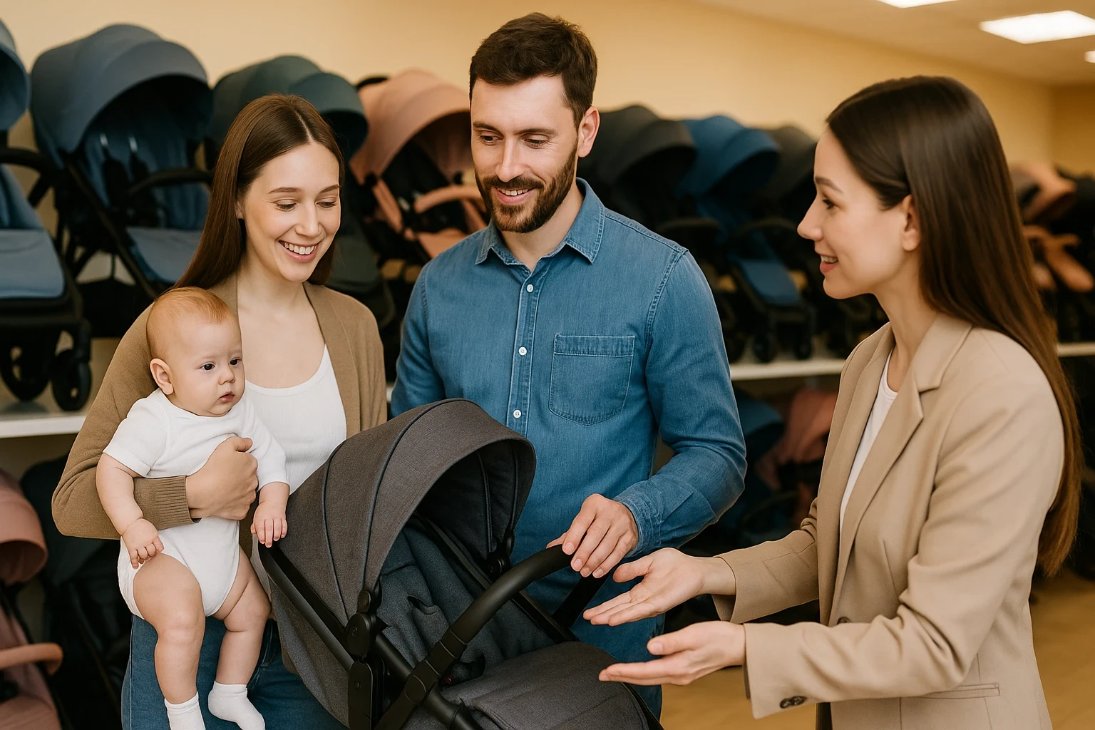 Проверьте складку одной рукой, фиксацию, люфты узлов. Оцените, удобно ли нести коляску.