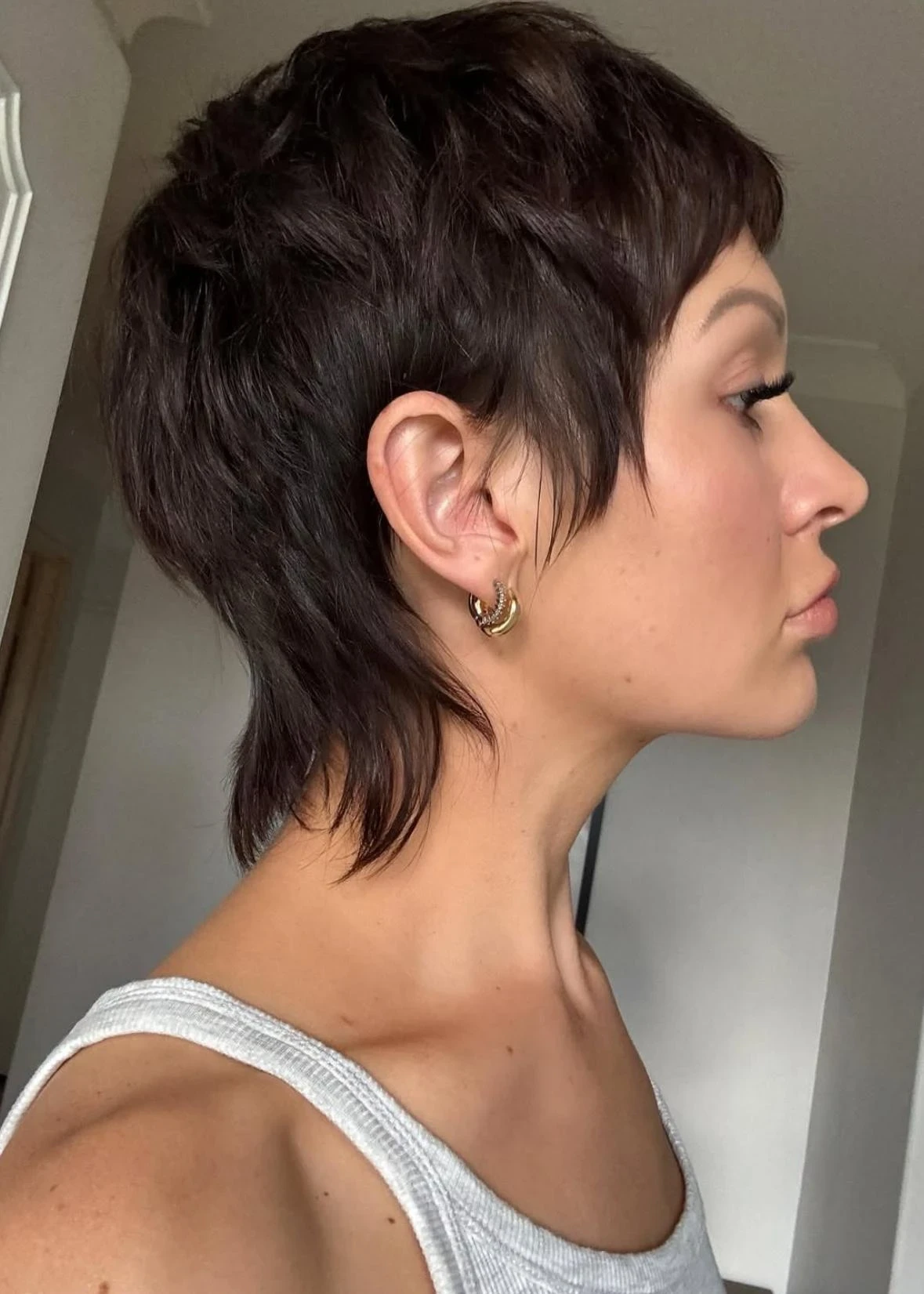 Современная вариация пикси — это легкая текстура, воздушность и объем на макушке. Для укладки достаточно небольшого количества мусса или пасты, а корни можно слегка приподнять феном — образ будет держать форму весь день. Пикси позволяет экспериментировать с длиной челки, асимметрией и даже выбритыми висками.