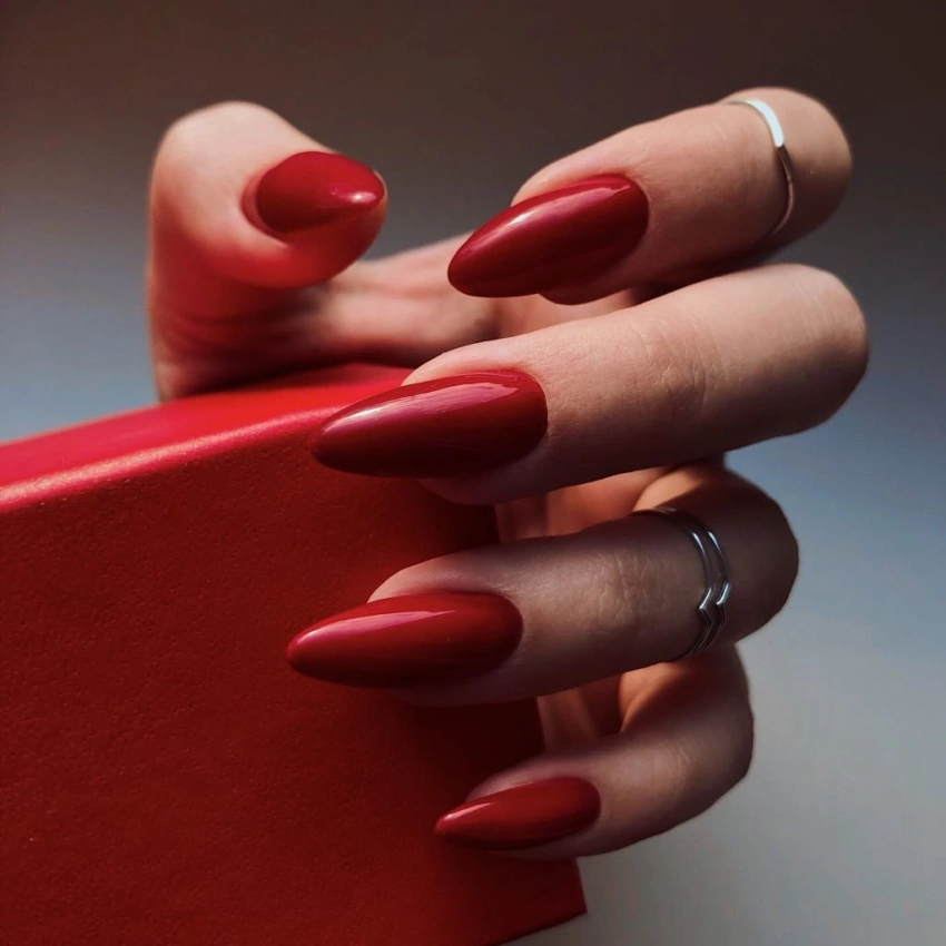 Не отказывайтесь от сплошного покрытия! В тренде — глубокие, сложные оттенки: ягодный бургунд, терракотовый красный, темный «красное вино». Секрет современной классики — в безупречной форме (мягкий квадрат или миндаль) и в одной-единственной детали. Добавьте к такому маникюру тонкую полоску сусального золота или серебра у кутикулы на одном или двух пальцах, или сделайте «золотую лунку». Это мгновенно делает образ дорогим и праздничным.