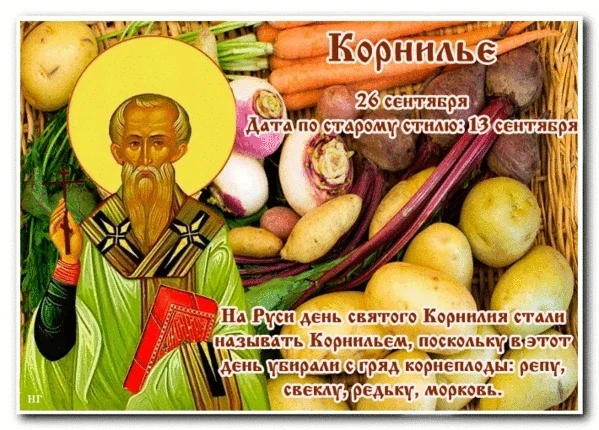 26 сентября в народном календаре отмечали праздник Корнилье, который был тесно связан с завершением сельскохозяйственных забот. Этот день считался последним сроком для уборки корнеплодов — свёклы, моркови, редьки, картофеля и репы. С наступлением холодов овощи уже не росли, а начинали портиться, поэтому крестьяне спешили собрать урожай, чтобы обеспечить семью запасами на долгую зиму.
