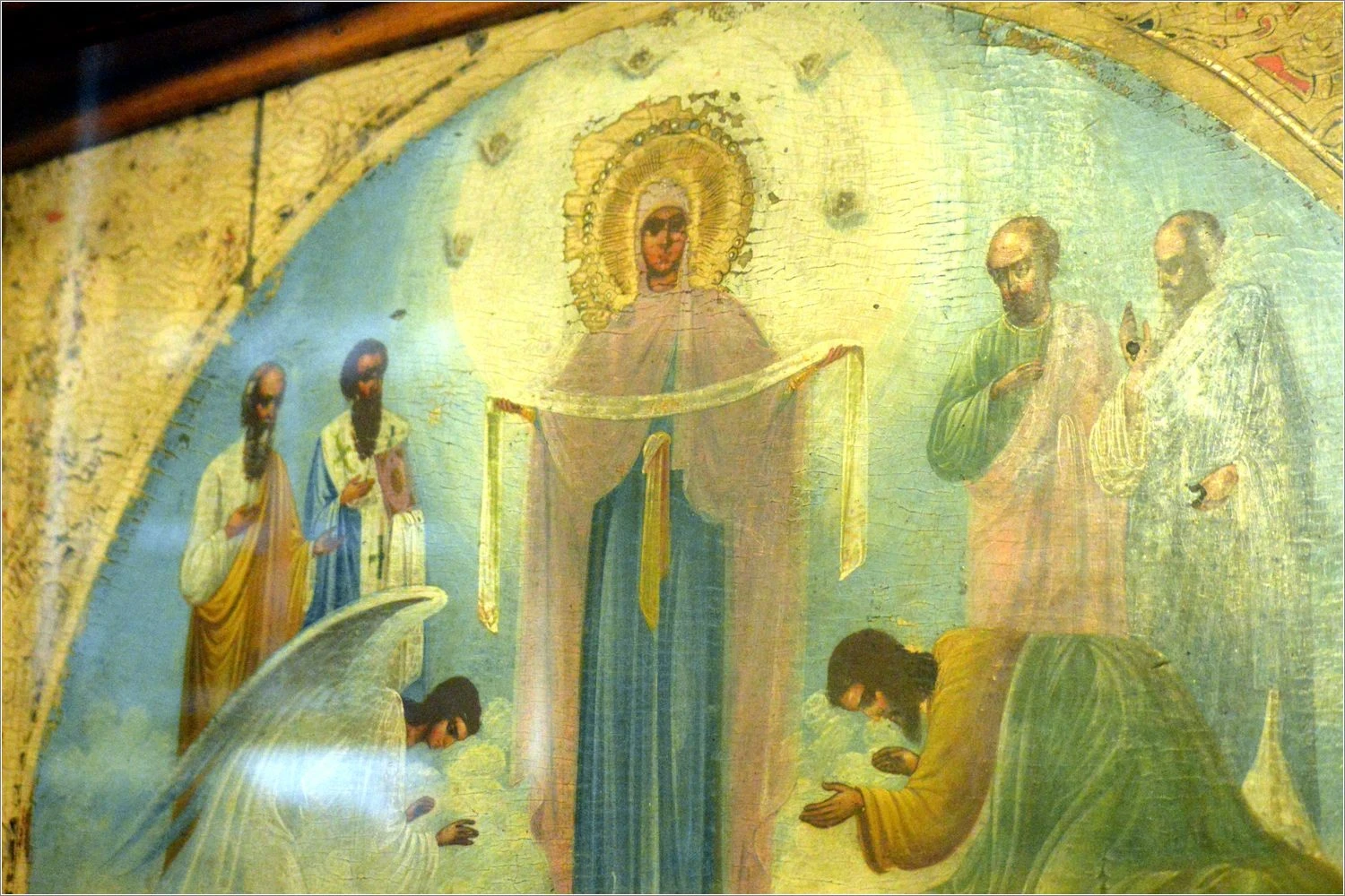 Мария сняла со своей головы омофор — покрывало — и распростёрла его над молящимися. В тот миг храм наполнился светом, а сердца людей — надеждой. После этого враги отступили. Константинополь был спасён.