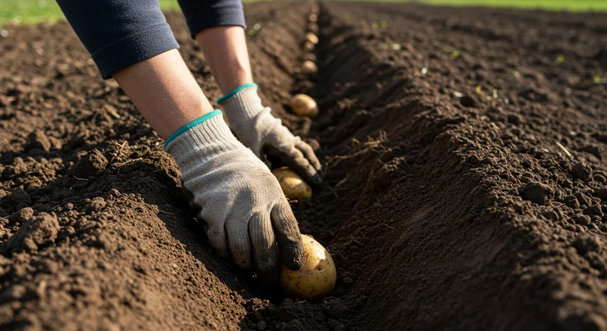 Если вы сажаете картофель «под лопату», стандартная глубина обычно составляет около 10 см (примерно половина штыка). После посадки над кустами формируют гребни, что способствует лучшему развитию растений.