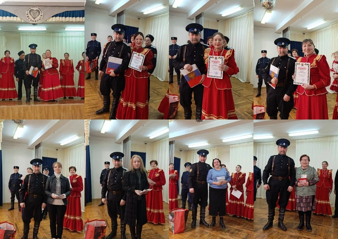 Завершился вечер ярким моментом: Атаман Игорь Владимирович Давыдов поздравил матерей-участниц коллектива и всех присутствующих женщин, отметив важность сохранения культурного наследия народа. Каждая мать получила заслуженную благодарность — грамоту и памятный подарок.