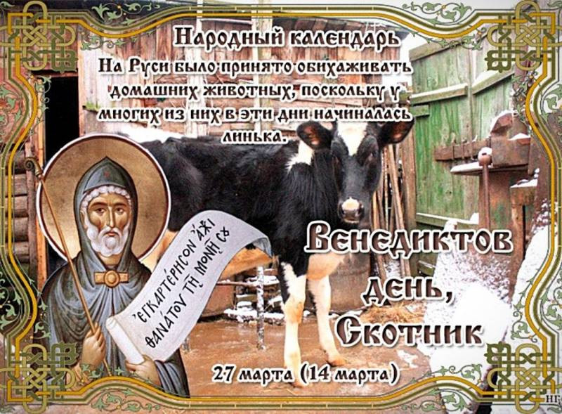Старинные поверья и погодные приметы, связанные со средой, 27 марта 2024 года, напрямую связаны с этническим праздником, известным как Венедиктов день. В древние времена на Руси этот праздник также называли Федор-скотником. Его происхождение связано с почитанием православной церковью святого Венедикта Нурсийского, небесного покровителя Европы и реформатора европейского монашества.